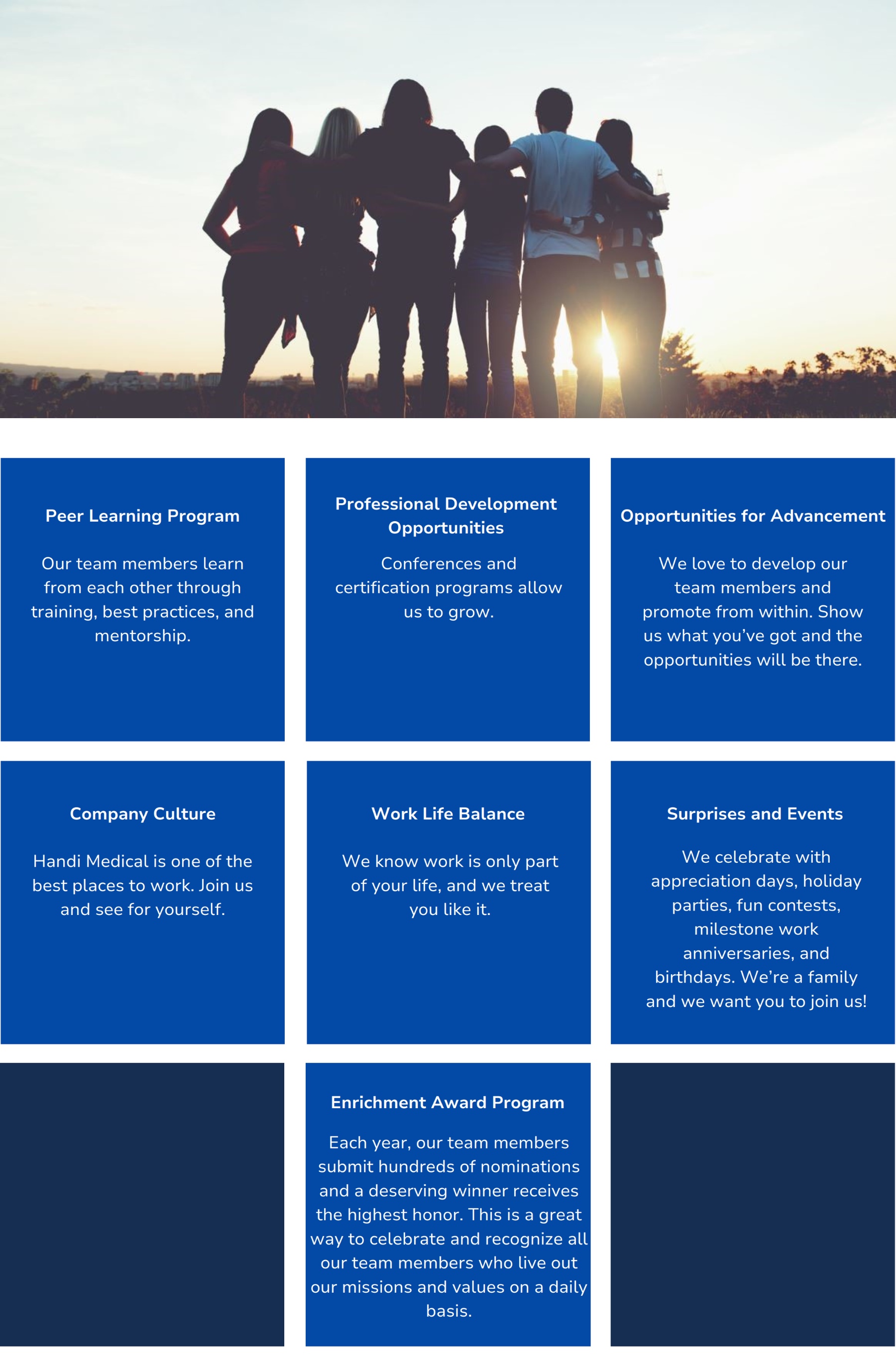 We want to help your career but we don't want your personal life to take a hit because of it. Daily life at Handi Medical Supply is the best in the business! When you come to work for us, you can look forward to these added benefits.